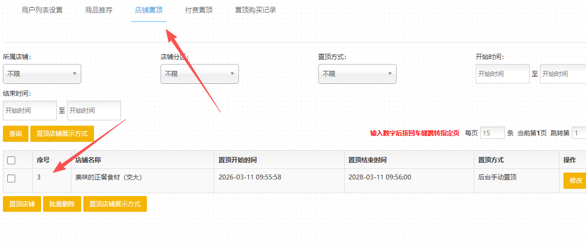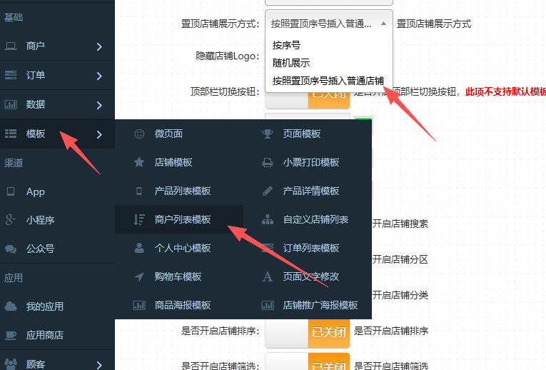九、店铺置顶功能升级,新增一种“按置顶序号插入普通店铺内显示”,可以做到“商家付多少钱就固定置顶在第几位” 操作方式:模板-商户列表模板